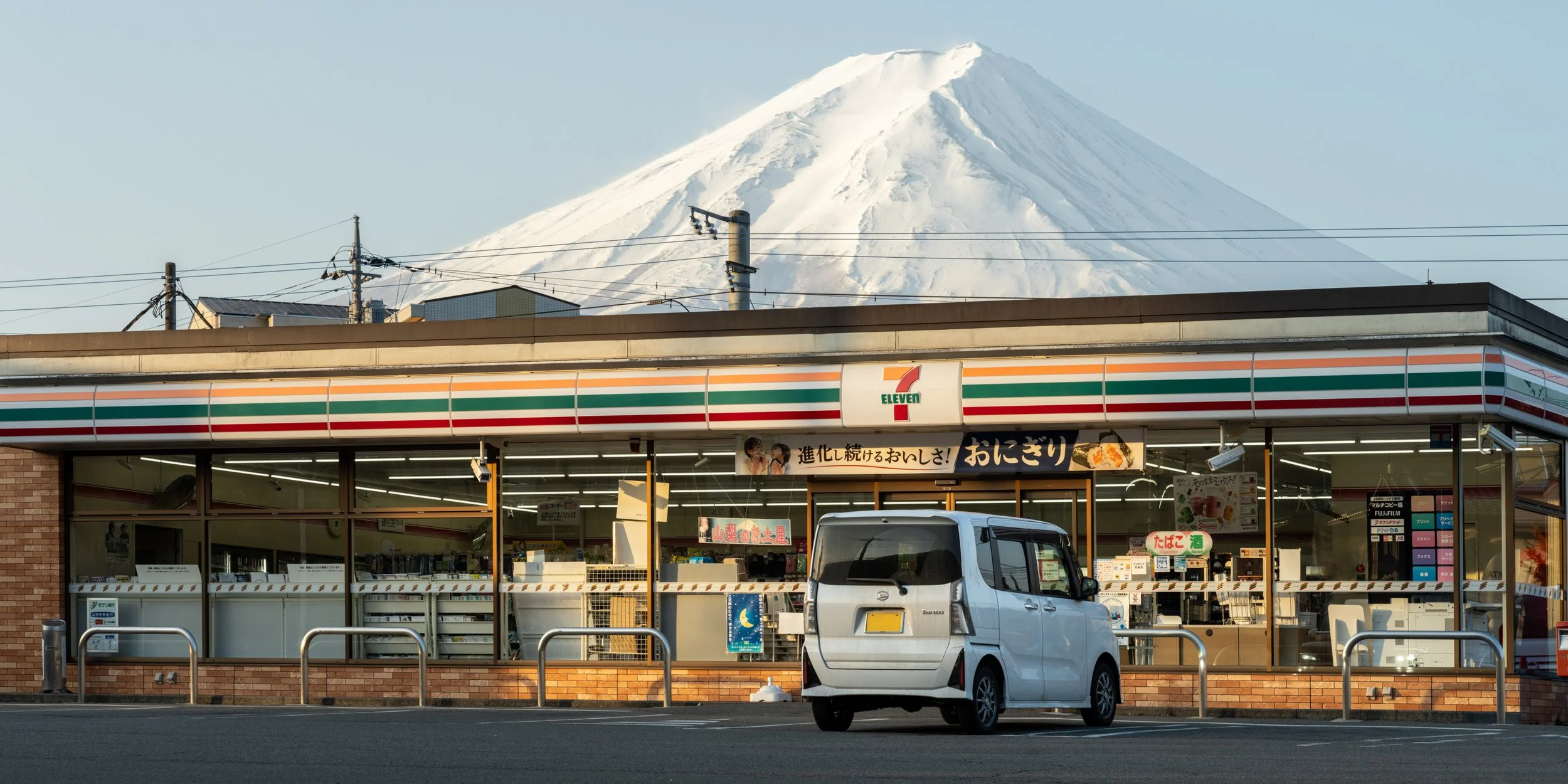 Later on once the sun had risen, I wanted to photograph the 7-11 just around the corner, as it faced the rising sun and would catch beautiful light on its facade. I had much more room to manoeuvre here, so was able to increase my focal length to 105mm. This is a composite of three side by side images. You can tell Fuji-San looks that little bit larger than the previous shot (but only slightly). Even though there is a car in this image, it's just such a typical Japanese car, that I think it works. Unlike the earlier Lawson image, the outside light is much stronger, so we can't see as much inside the store. The car adds a nice touch!