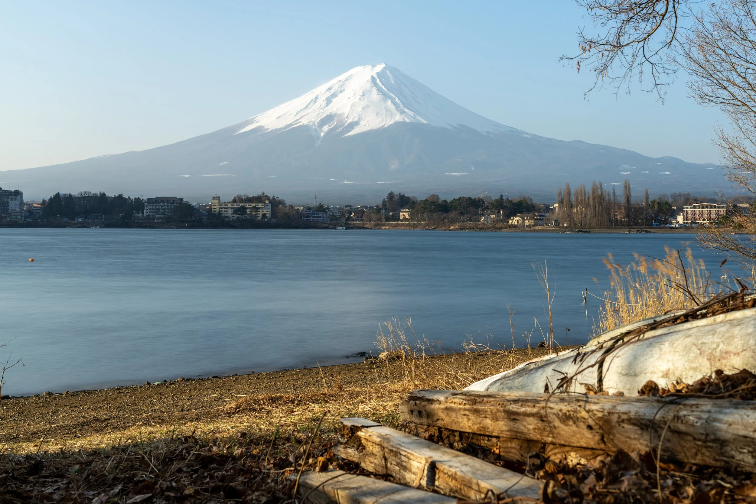 The first spot that I really liked was the lookout just below the opposite side of the Lake Kawaguchi Grand Bridge. On the map it's near the '9 Azagawa' spot. There are a bunch of dilapidated boats to use in the foreground, and a clear view over to the mountain. The shot below was a few hours after sunrise. After seeing this spot on my ride, I came back here the next morning.