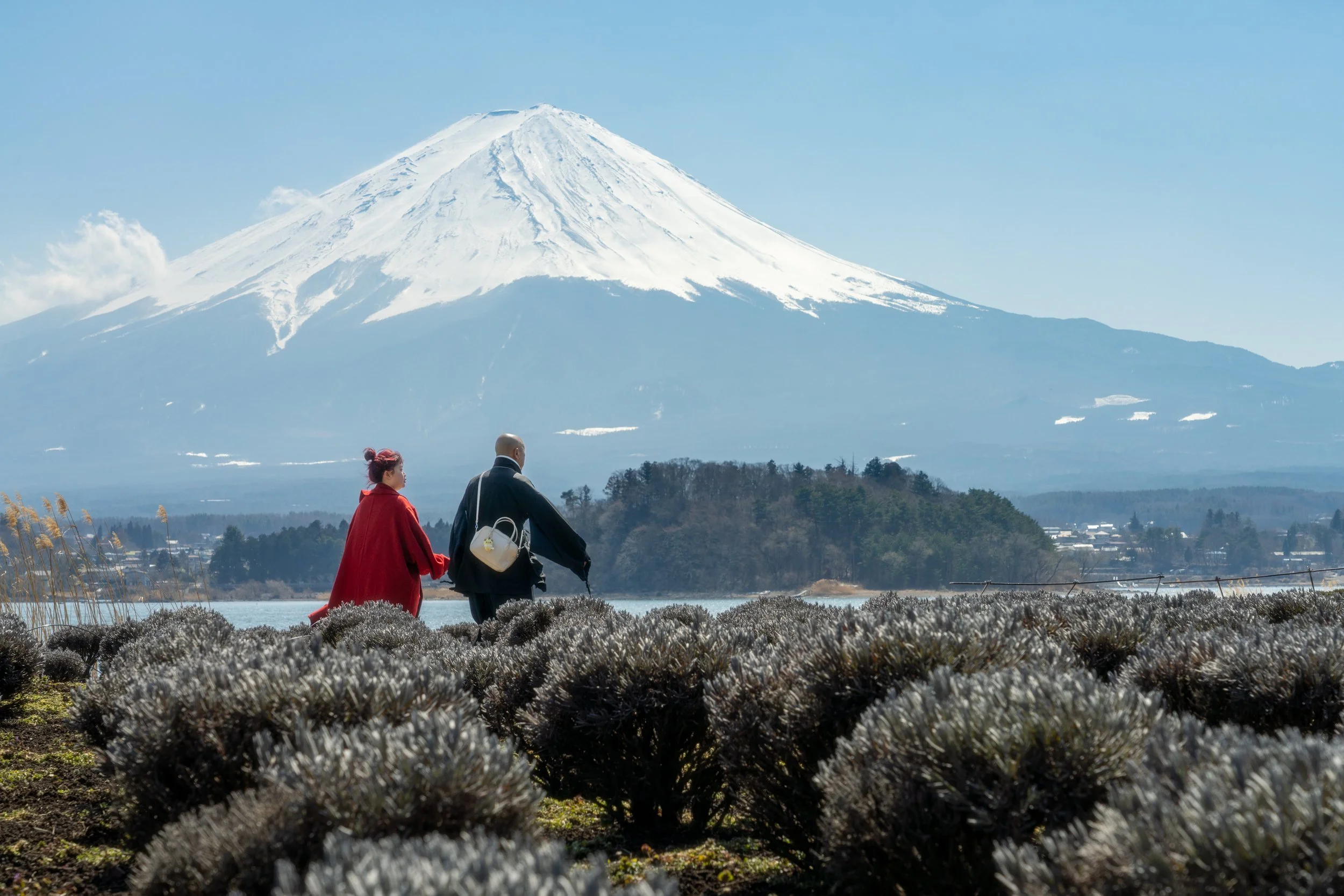 A spot that's also pretty famous to shoot from is the Lavender garden near the Kawaguchiko Natural Living Centre (Oishi Park on the map). While there wasn't any lavender blooming, there was delicious soft serve at the cafe, and lots of people around. I spotted these two fabulously fashionable people strolling along the foreshore in front of the lavender plants.
